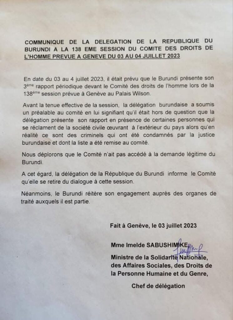 Le 03 juillet 2023, la délégation du gouvernement burundais s’est retirée brusquement d’une réunion sur les droits humains, organisée par les Nations Unies à Genève, en Suisse.